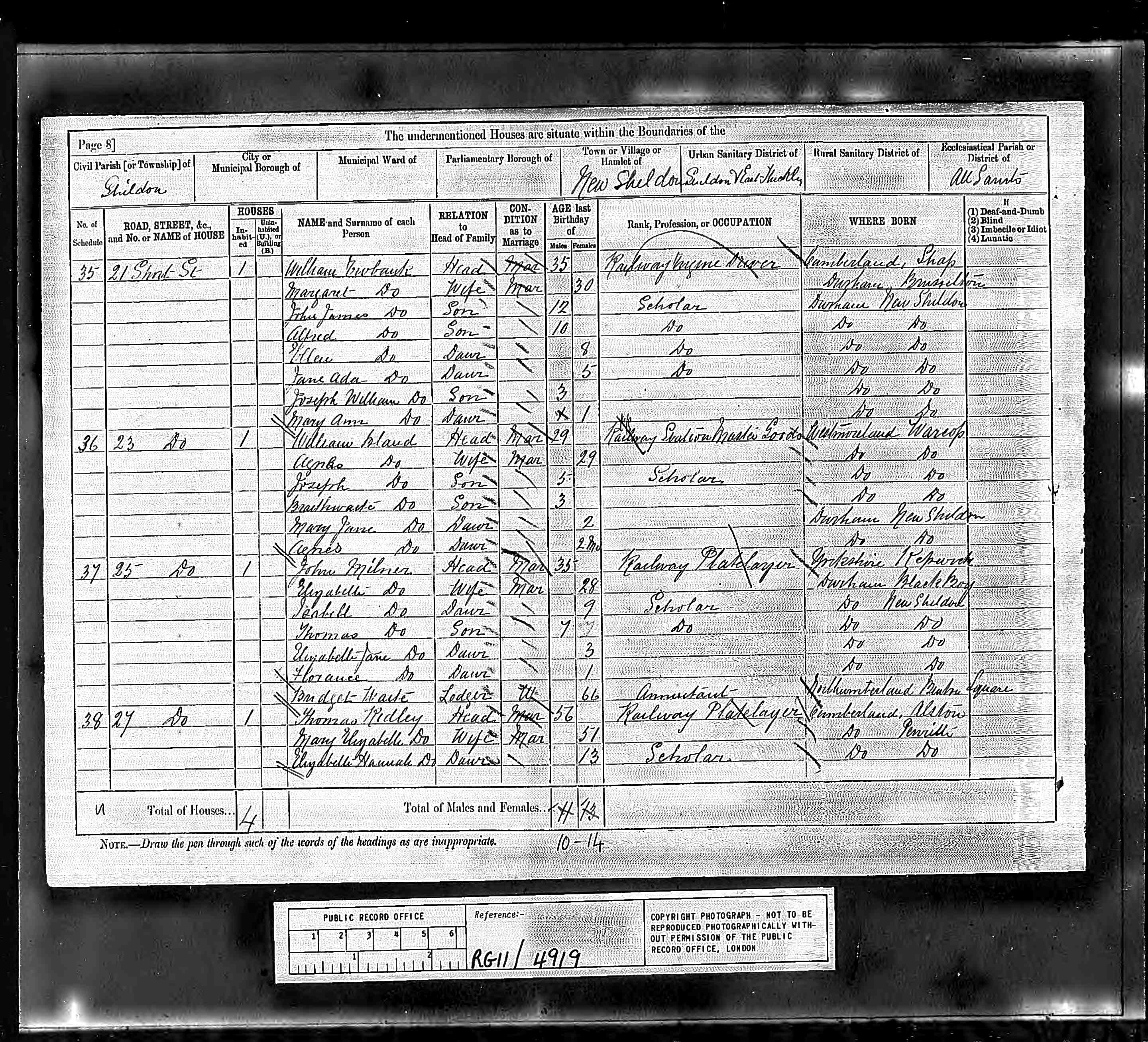 | John Milner | Head | Mar | 35 | Railway Platelayer | Yorkshire Kepwick | ||