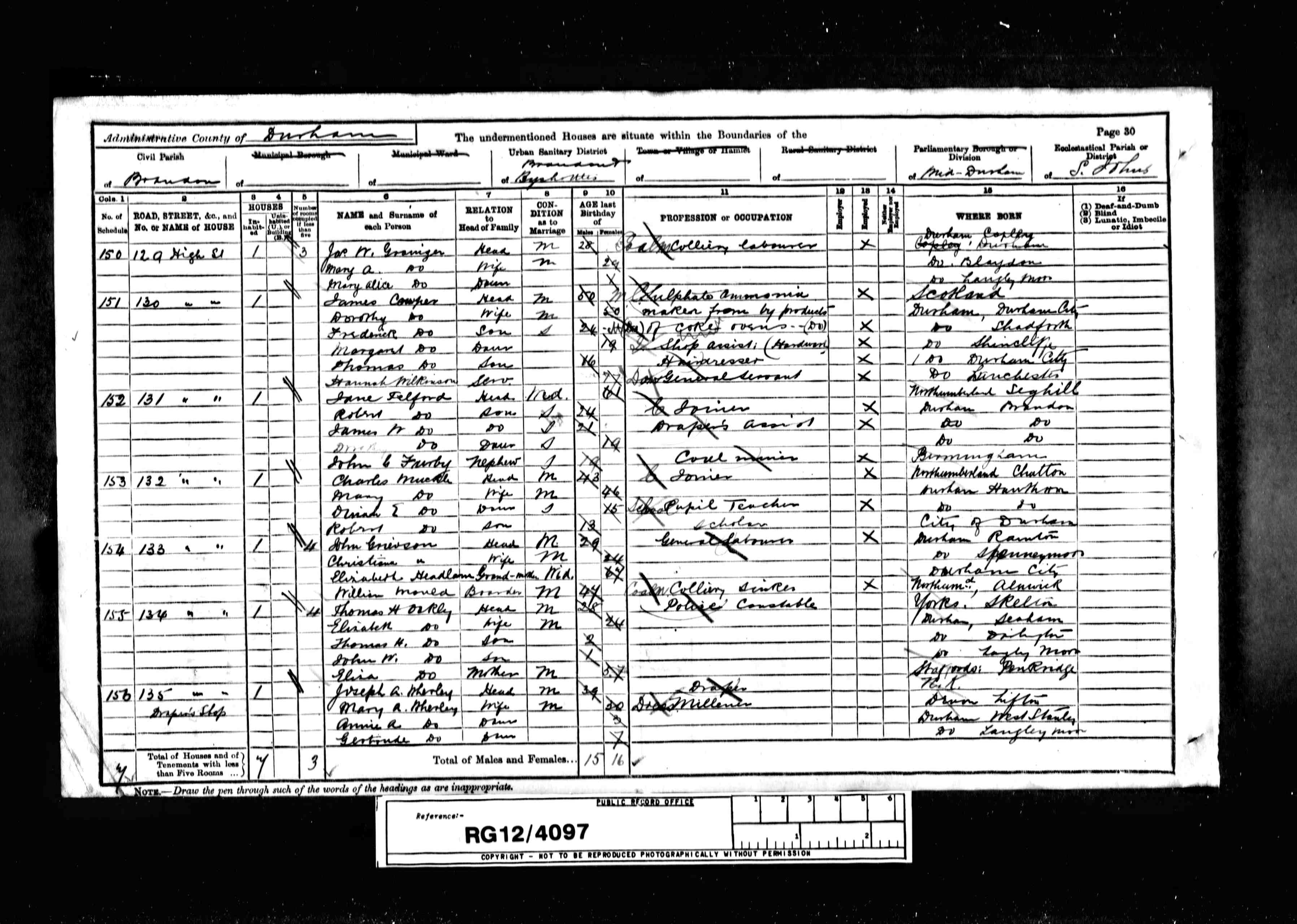| Dorothy do. | Wife | M | 50 | Durham, Durham City | ||||||