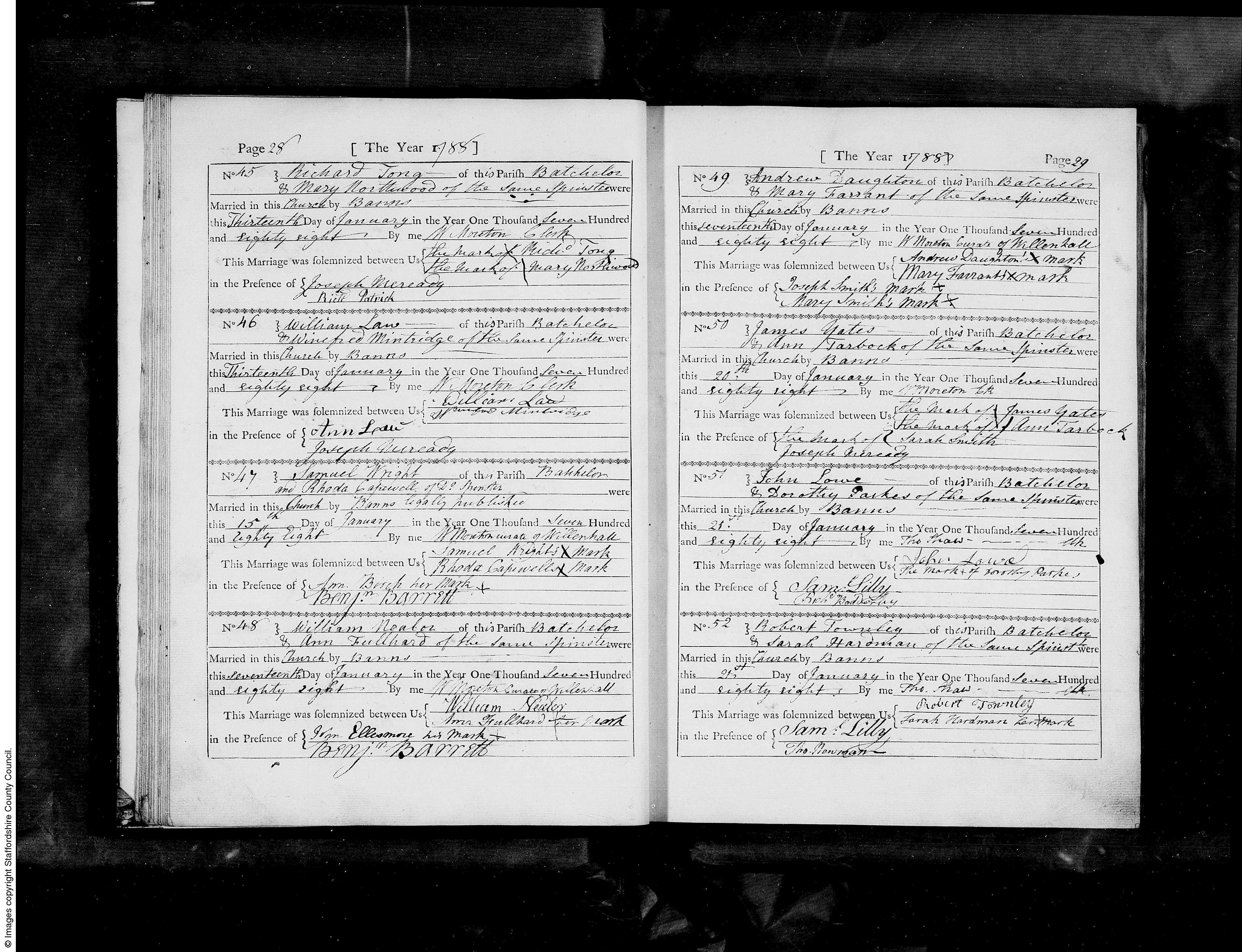 | Full Text | No 45. Richard Tong of this Parish Batchelor & Mary Northwood of the same Spinster were Married in this Church by Banns this Thirteenth Day of January in the Year One Thousand Seven Hundred and Eighty eight by me W Norton Clerk This marriage was solemnized between us the mark X of Richd Tong the mark X of Mary Northwood In the presence of Joseph McReady Rich'd Patrick |