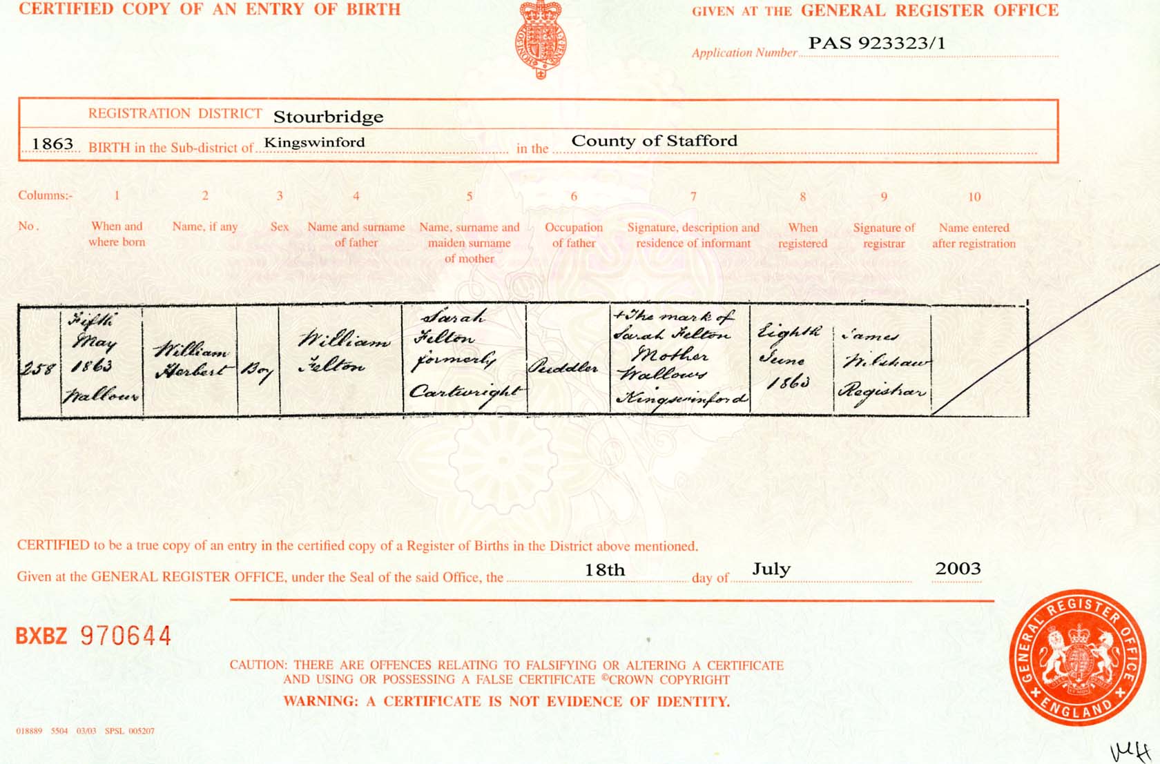 | Informant | + The mark of Sarah Felton Mother Wallows Kingswinford |
