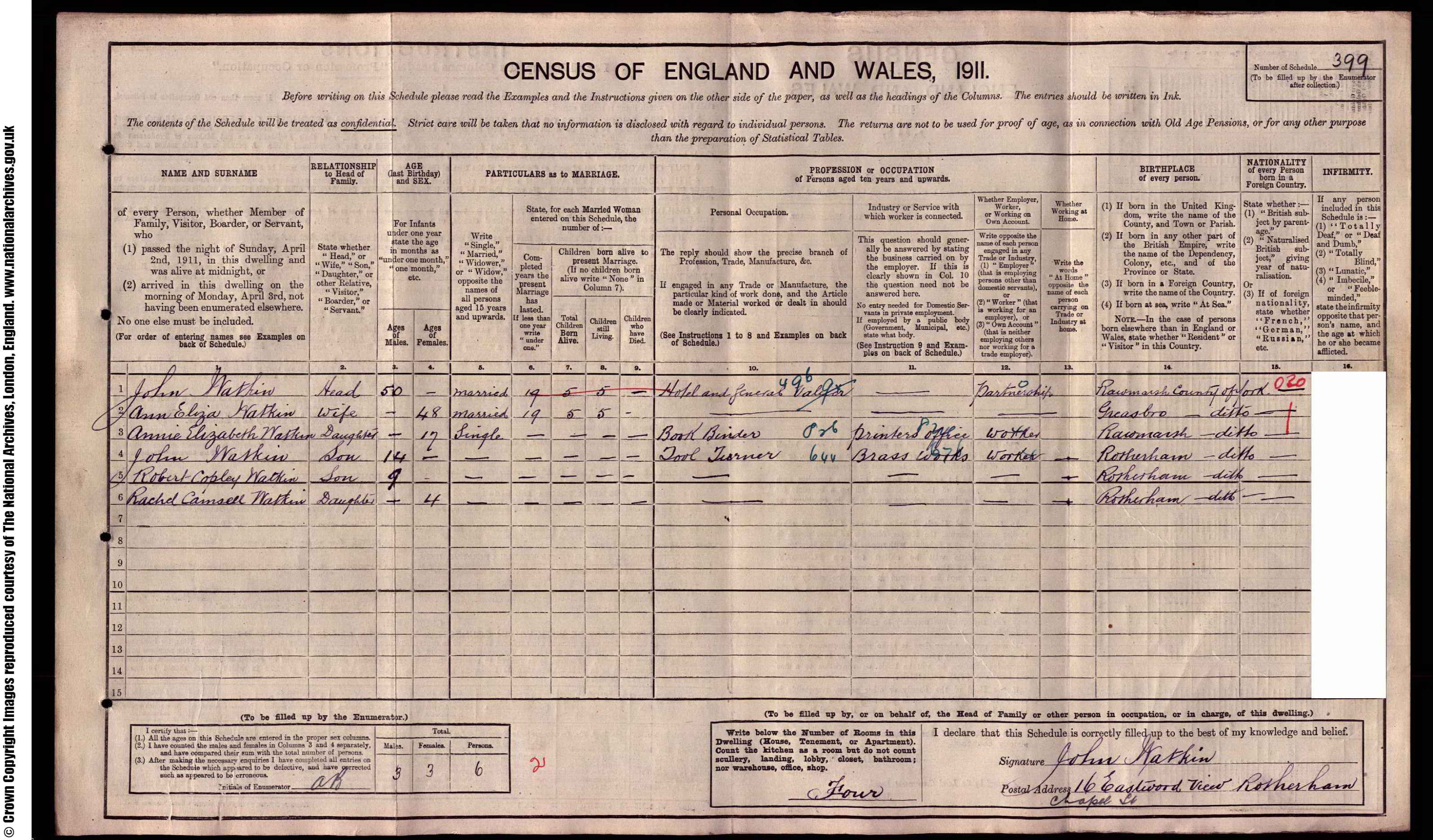| John Watkin | Head | 50 | Married | 19 | 5 | 5 | - | Hotel and General Valuer | Partnership | Rawmarsh County of York | |||||