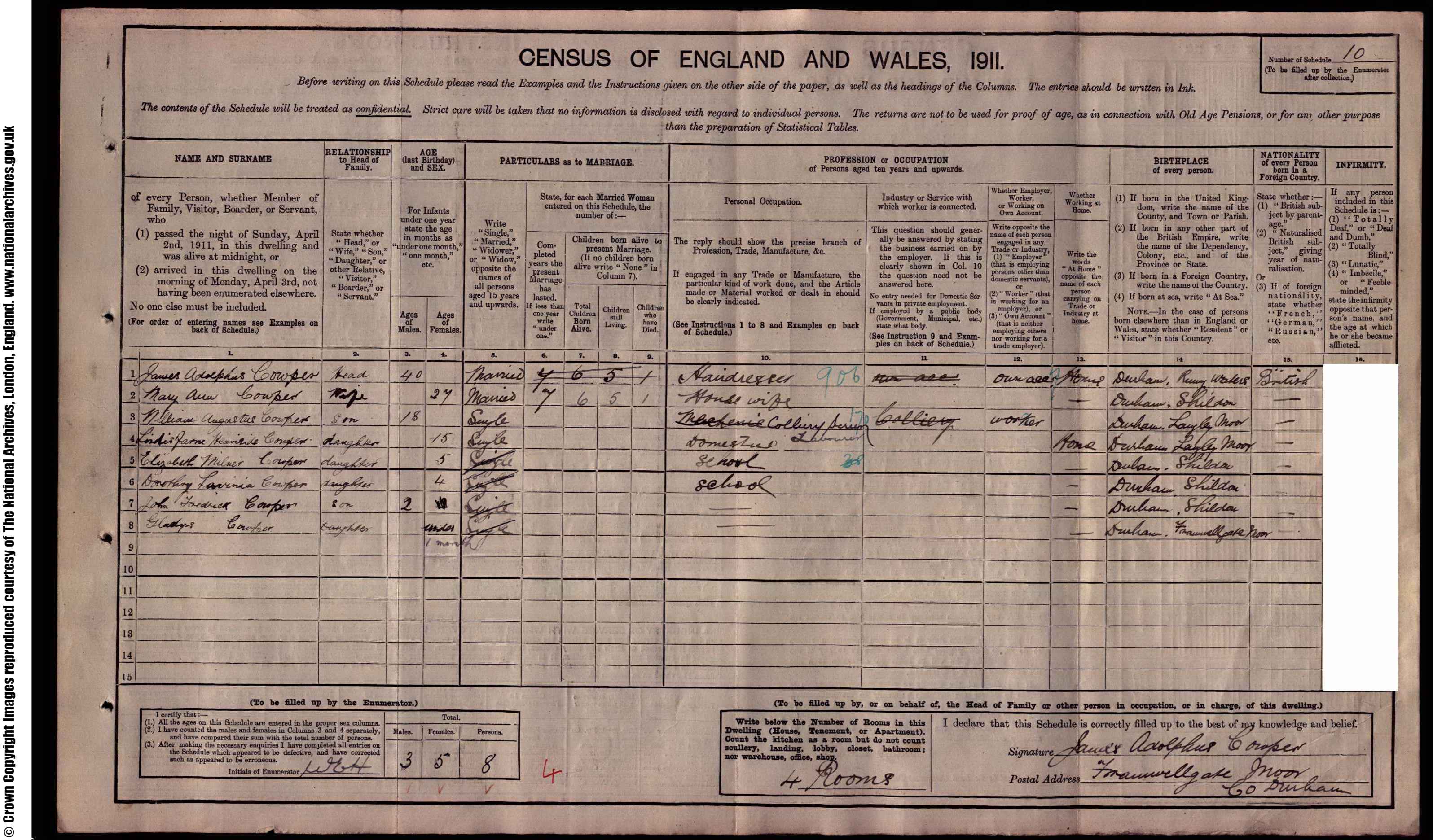 | James Adolphus Cowper | Head | 40 | Married | 7 | 6 | 5 | 1 | Hairdresser | Own account | Durham, Running Waters | |||||