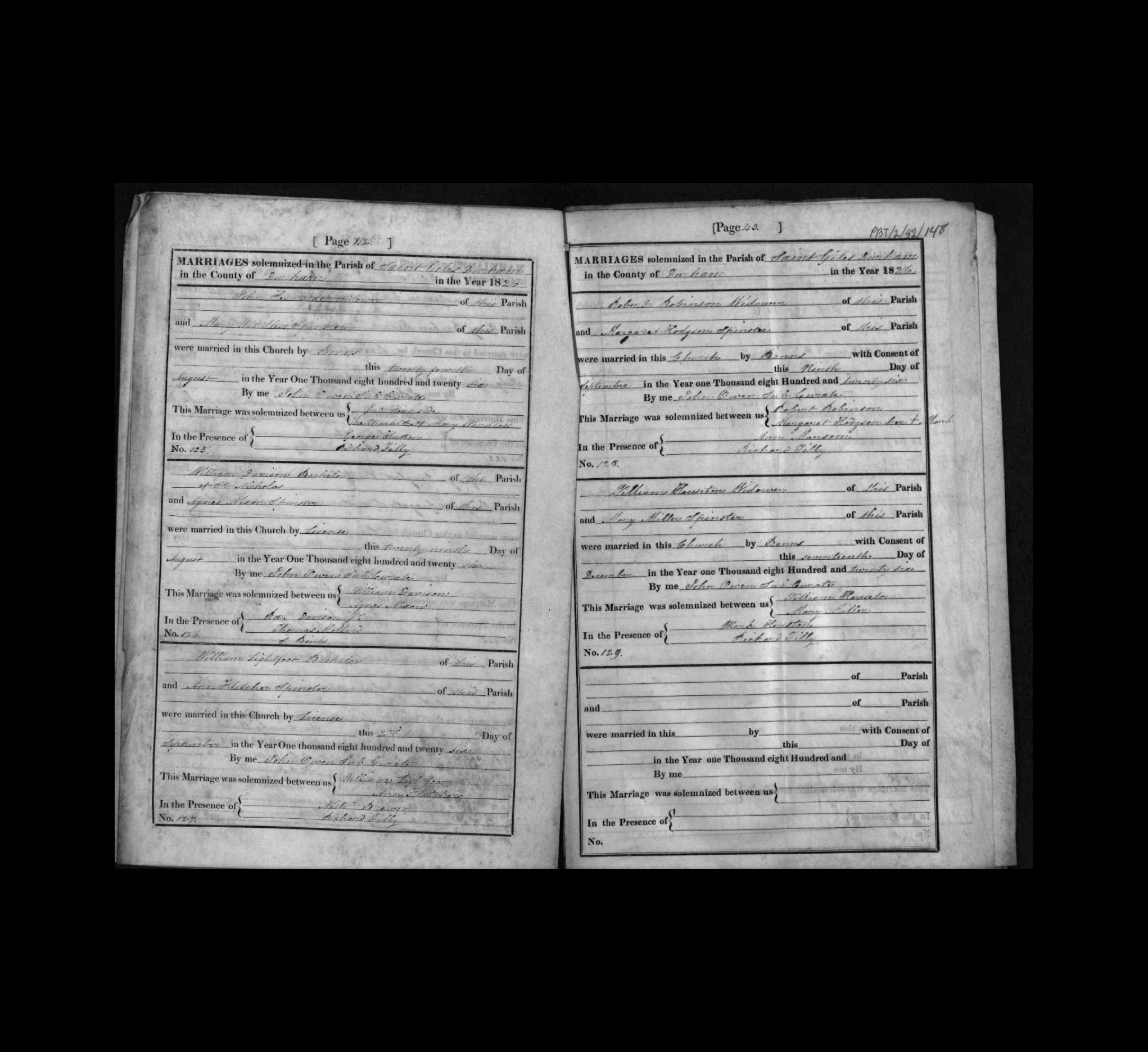| Full Text | John Heaviside, Widower of this Parish and Mary Wandless, Spinster of this Parish were married in this Chrch by Banns this twenty fourth Day of October in the Year One Thousand Eight Hundred and twenty six By Me John ??? Curate This marriage was solemnized between us John Heaviside & The Mark X of Mary Wandless in the presence of George Hutton & Richard Kelly |